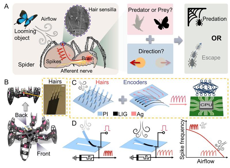 非接触感知对众多生物而言至关重要,因为这项技能能使其在无直接接触的情况下预先感知环境变化与潜在威胁。非接触感知模式中,视觉具有最高的分辨率,但却具有最高的功率密度。为平衡感知范围与能耗,蜘蛛的光感受器密度虽比哺乳动物低20倍,但其全身的毛形感受器密度极高(400 /cm2)。毛形感受器可将外部非接触刺激(如猎物或天敌运动时引发的气流)转化为脉冲序列,每个感受器每次感知的能耗不足 100 pJ,能量密度比视觉系统中的感受器低数百倍。这种策略能在实现大面积感知覆盖的同时最大限度降低能耗,并能够连续感知,不受视觉盲区、低能见度等限制。现阶段多数非接触触觉传感器将输入编码为调幅信号,而生物感知受体则将信息编码为调频信号。近年来,集成传感器与振荡神经元器件(编码器)的人工脉冲感受器取得进展,可直接将感知信息编码为脉冲序列。但研制具备脉冲编码能力的仿毛形感受器仍处在瓶颈期,同时低功率密度的非接触感的意义也未被充分认知。