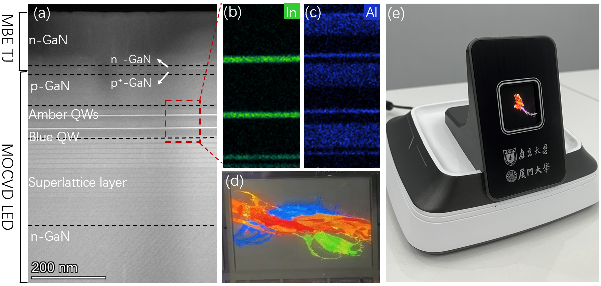 图1:(a)隧道结红光Micro-LED透射电子显微镜图;混合量子阱(b)In和(c)Al元素EDS图;(d)-(e)全氮化物全彩显示屏