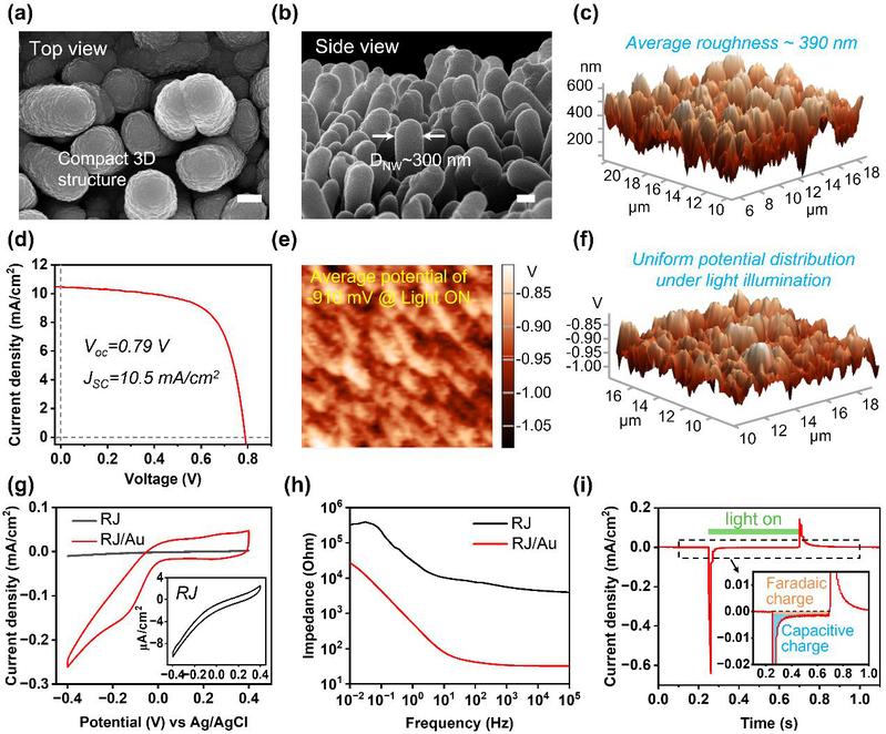 图2 径向结光电贴片的形貌与光电性能表征。(a,b)RJ结构的俯视与侧视SEM图像;(c)RJ结构的表面粗糙度(平均值约为390 nm);(d)标准AM 1.5G太阳光照条件下RJ贴片的电流-电压(J-V)特性曲线;(e,f)在光照条件下RJ结构的表面电势分布;(g)、(h)和(i)分别为RJ/Au器件在PBS溶液中的循环伏安(CV)曲线、电化学阻抗谱(EIS)和单个LED光脉冲下的光电流响应。