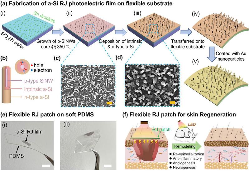 在皮肤伤口愈合过程中,感觉神经的修复常常滞后于表皮组织的恢复,造成神经功能恢复不完全,影响患者健康和生活质量。近年来,外部电刺激因其能够促进神经突起生长、提升伤口愈合效率,在加速神经再生领域展现出广阔前景。然而,现有临床电刺激手段大多依赖经皮导线传输,操作复杂、感染风险高,且易引发患者不适。相比之下,光电刺激技术通过将光能直接转化为电信号,能够实现远程、精准的非接触式调控,为术后感染控制和神经系统的无创/微创调控提供了新思路。在众多光电材料中,硅(Si)因其优异的半导体特性与良好的生物相容性,被广泛视为理想的光电活性材料。基于团队提出的低温自组装气-液-固(VLS)生长策略(详见附录),已在柔性金属基底(如铝箔、不锈钢箔)上构筑了具高效光吸收能力的三维径向p-i-n结(RJ)硅纳米线(SiNW)结构,并应用于心脏起搏与脉搏检测等场景。但在长期神经调控等生物组织接触场合,该类结构仍存在机械匹配性差、刺激效率衰减等问题,亟需在材料设计与界面工程方面进一步优化。