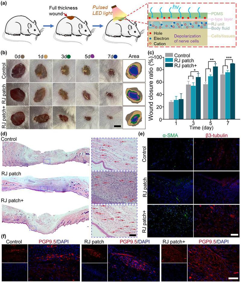 图4 RJ patch结合光电刺激促进全层皮肤缺损和神经再生的疗效。(a)动物实验示意图及RJ patch在光电刺激下促进皮肤组织再生的机制示意图;(b)伤口愈合过程图像;(c)不同时间点的伤口愈合率统计分析;(d)伤口组织的H&E染色,红色箭头标示新生血管;(e)伤口部位α-SMA(绿色)β3-Tubulin(红色)免疫荧光染色;(f)伤口区域神经标志物PGP9.5的免疫荧光染色。
