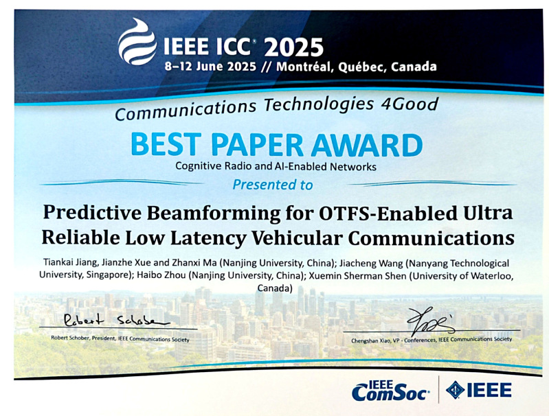 2025年6月8日至12日,通信领域旗舰会议IEEE International Conference on Communications (IEEE ICC) 2025在加拿大召开,blh漫画 周海波教授团队的论文“Predictive Beamforming for OTFS-Enabled Ultra Reliable Low Latency Vehicular Communications”获得最佳论文奖(Best Paper Award),这也是本次大会认知无线电和智能网络分会唯一获奖论文。本次ICC大会共收到来自不同国家和地区的约2500篇投稿,经专题技术委员会评审和推荐,最终评选出17篇获最佳论文奖,占总投稿论文数的约0.68%。
