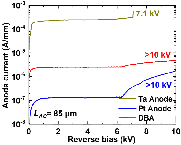 Fig. 3 | Reverse I-V characteristics of DBA anode device, Pt anode device and Ta anode device.