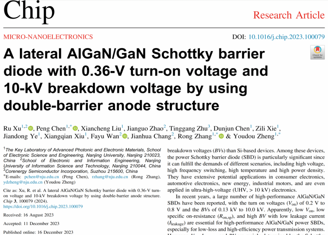 Recently, the team of Professor Chen Peng and Zhang Rong from School of Electronic Science and Engineering published a research paper, titled A Lateral AlGaN/GaN Schottky barrier diode with 0.36 V turn-on voltage and 10 kV breakdown voltage by using double barrier anode structure, on the Journal Chip. The research achieved a lateral AlGaN/GaN Schottky barrier diode with a 0.36 V turn-on voltage and a 10 kV breakdown voltage by employing a double barrier anode structure. Dr. Xu Ru is the first author, and the corresponding authors are Prof. Chen Peng, Prof. Zhang Rong, and Prof. Zheng Youdou. (//doi.org/10.1016/j.chip.2023.100079)